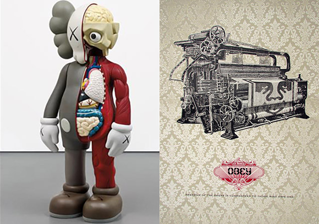 Right: Untitled by Shepard Fairey, 2012, multiple process (relief and screenprint)
